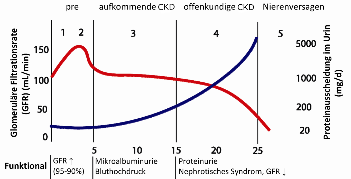 blaue Kurve: Albumin/Protein-Ausscheidung; rote Kurve: GFR; Bild aus Drube J et al, Diabetologie und Stoffwechsel 2017, 12(03):213-221.